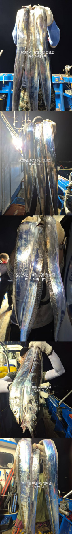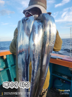 안녕 하십니까여수 매니아호 입니다 오늘 갈치 다녀 왔습니다씨알좋은 갈치가 막 퍼물기 시작하였지만 풍랑 예비특보로 인하여조기 철수를 하였습니다. 그중에서도 쿨러가득 채우신 조사님도 있었습니다예보상 기상좋아지는 24일 금요일부터 출항 예약가능 기상 좋아지는 날 무조건 출항 예약가능 합니다.오늘 출조하신 조사님 정말 수고 많았습니다. 매일 갈치출항 !!자리배정 전원추첨!! ✔️ 10월 24일 금요일 갈치낚시 예약가능 오후2시 추첨후 출항✔️ 10월 25일 토요일 갈치낚시 예약마감 오후1시 추첨후 출항✔️ 10월 26일 일요일 갈치낚시 예약가능 오후1시 추첨후 출항✔️ 10월 27일 월요일 갈치낚시 예약가능 오후1시 추첨후 출항 사이트 예약가능 자세한 사항은 전화문의 바랍니다010-6365-5427//010-6887-6556 ▣ 갈치출항시간 : 여수 오후3시 추첨후 출항/ ▣ 입항시간 : 오전 7시~8시입항 (유동적)▣ 선사 제공 : 얼음, 음료, 석식 제공▣ 개인 준비물 : 멀미약.낚시대,전동릴, 쿨러.장갑.칼.구명동의 등▣ 출조점 대여 : 릴(2만원),낚시대(1만원),쿨러(1만원)▣ 출조점 판매 :기둥줄.바늘.집어등▣ 예약및 자리배정: 우선지정 단체4인 이상 일렬지정. 2순위 연박. 4인이하 전원 추첨. 매니아 예약폰: 010-6365-5427/ 김선장 010-6887-6556※예약문의 : 010-6887-6556//010-6365-5427※오시는길 : 전남 여수시 신월동 120-46 // 경남 통영시 산양읍 원항1길 208매니아피싱 밴드가기: